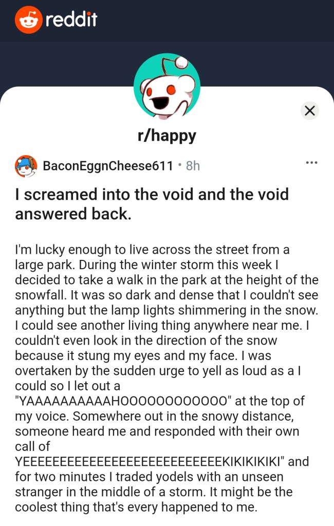 In addition to my time spent watching birds, I also waste precious wing-flapping time scrolling the Internet for stories about the moments when strangers find one another in a planet full of noise. Here are a few of my favorites: