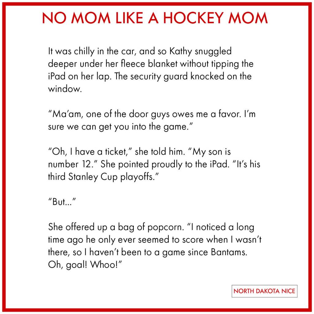 […] I put up another one of my Flash Fiction stories – this one based on a conversation I had with another hockey mom, who said her son only scores when she’s in the bathroom. You can read it here. […]