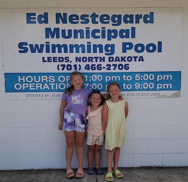 Olivia (age 8), Isabel (age 5), and Emma (age 4) Tufte are selling lemonade in order to raise enough money to repair the Ed Nestegard Municipal Swimming Pool in Leeds, North Dakota. Last year, they raised $1,150. This year, they are at $1,625 to date. If you are able, please help them out by donating! Click here to send money via their mom, Carrie. You can also get in direct contact with the Leeds Park Board by clicking here.
