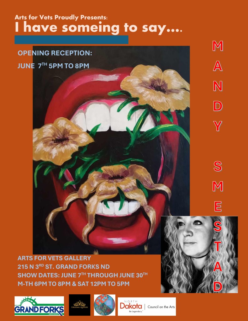 The opening reception for the latest Arts for Vets show is today – Friday, June 7, starting at 5PM. The show will feature surrealist artist Mandy Smestad, and will be available through June 30 at 215 North Third Street. From Arts for Vets: Works of women, still life, and life inspired by Mandy’s unique, and color-filled life. Mandy is the recipient of ERA International Woman’s Exhibit “Inspire Inclusion” Show Award. Limited Edition posters of her work, “Rainbow Woman,” will be available, along with original works and prints.