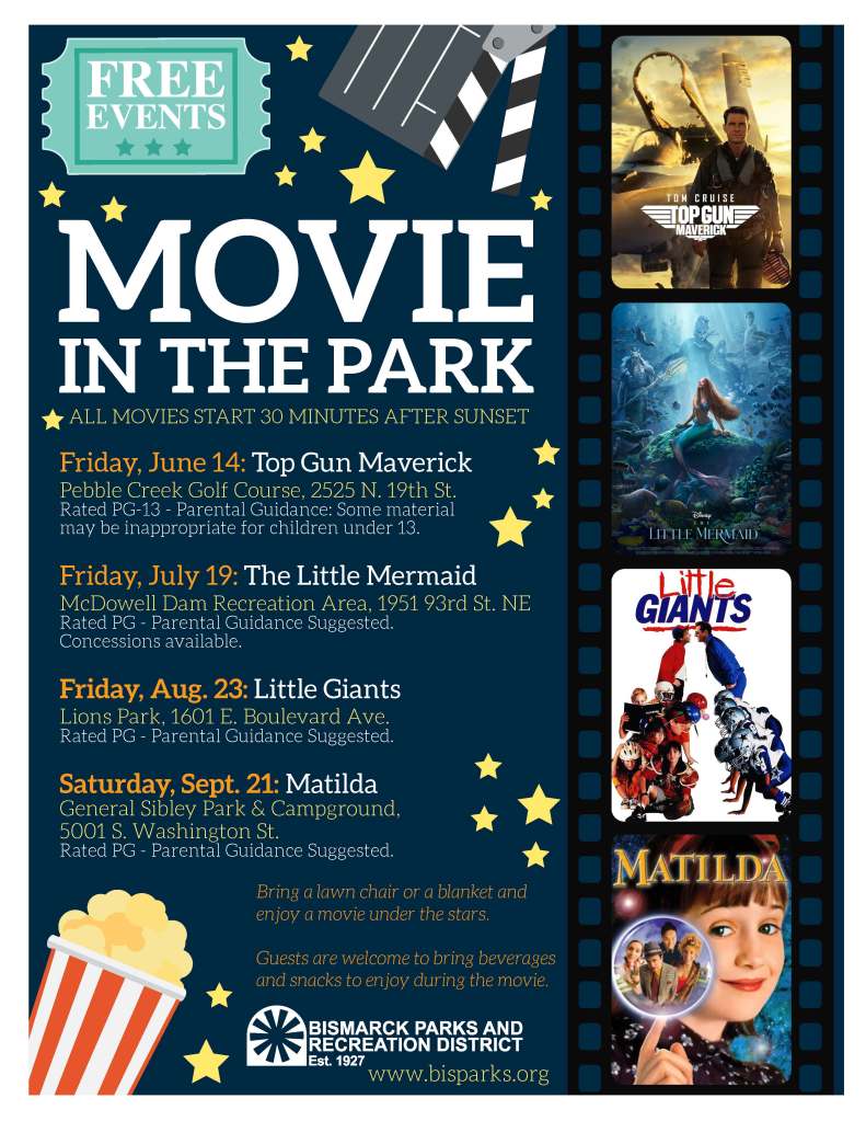 The 2024 is schedule is posted at https://www.bisparks.org/movie-in-the-park-bismarck-parks/, or you can check out the flier below. All movies are free and open to the public. Bring a law chair or a blanket. You are also welcome to bring non-alcoholic beverages and snacks to enjoy. This is the 7th season of Movie in the Park, and evening typically average 200 people in attendance.
