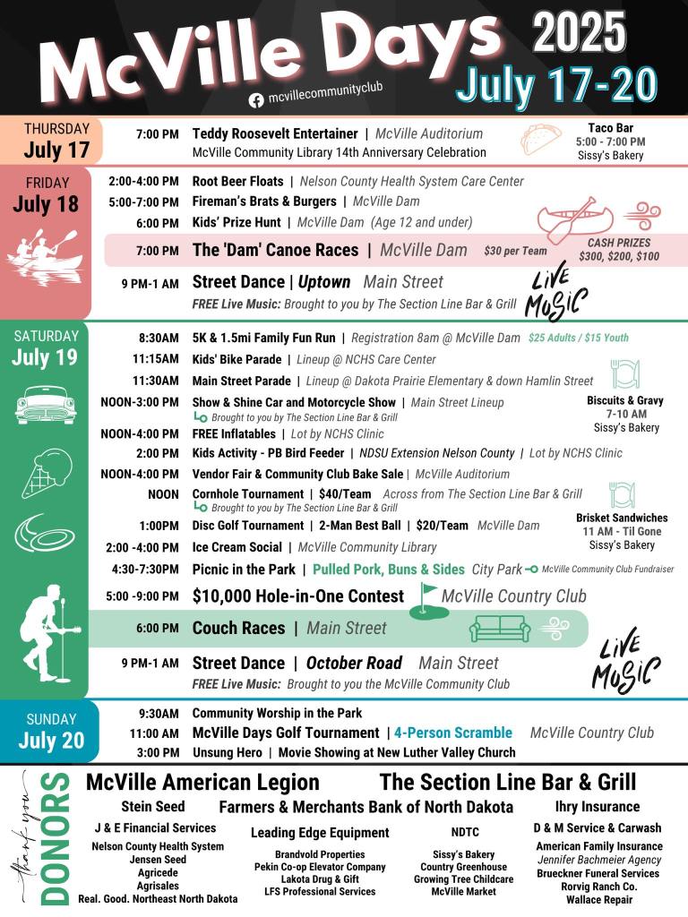 McVille Days has been a long-standing tradition and draws MANY people each year, whether they are coming home to see family, from neighboring communities, or from farther away. The McVille Community Club organizes this event and is supported by donations from businesses that serve our community and through local fundraisers. We couldn’t provide such a fun-filled weekend and so many free activities for families without local support. This is a weekend that really helps our small businesses thrive, so please be sure to support them while you are here. =) Follow our Facebook Page for more information (click here).