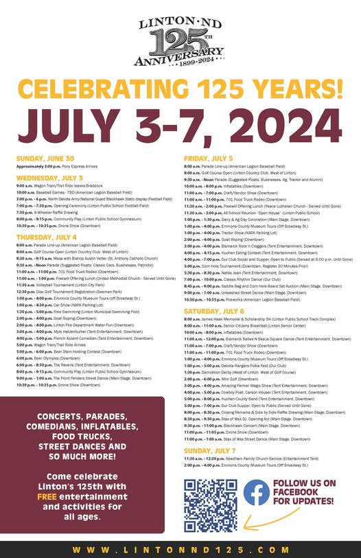 Want to keep the 4th of July festivities going with a townful of really nice people doing all sorts of fun (and free!) stuff? Head on over to Linton for their 125th anniversary!