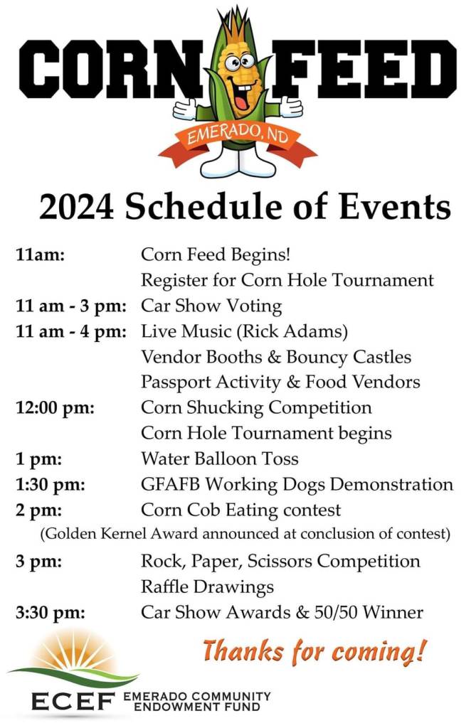Did you know that North Dakota produced a record-high 543 million bushels of corn in 2023? And how many of those bushels did you eat…one? You can get those corn cob-eatin’ numbers up at the 10th annual Emerado Corn Feed on Saturday, August 17, 2024.