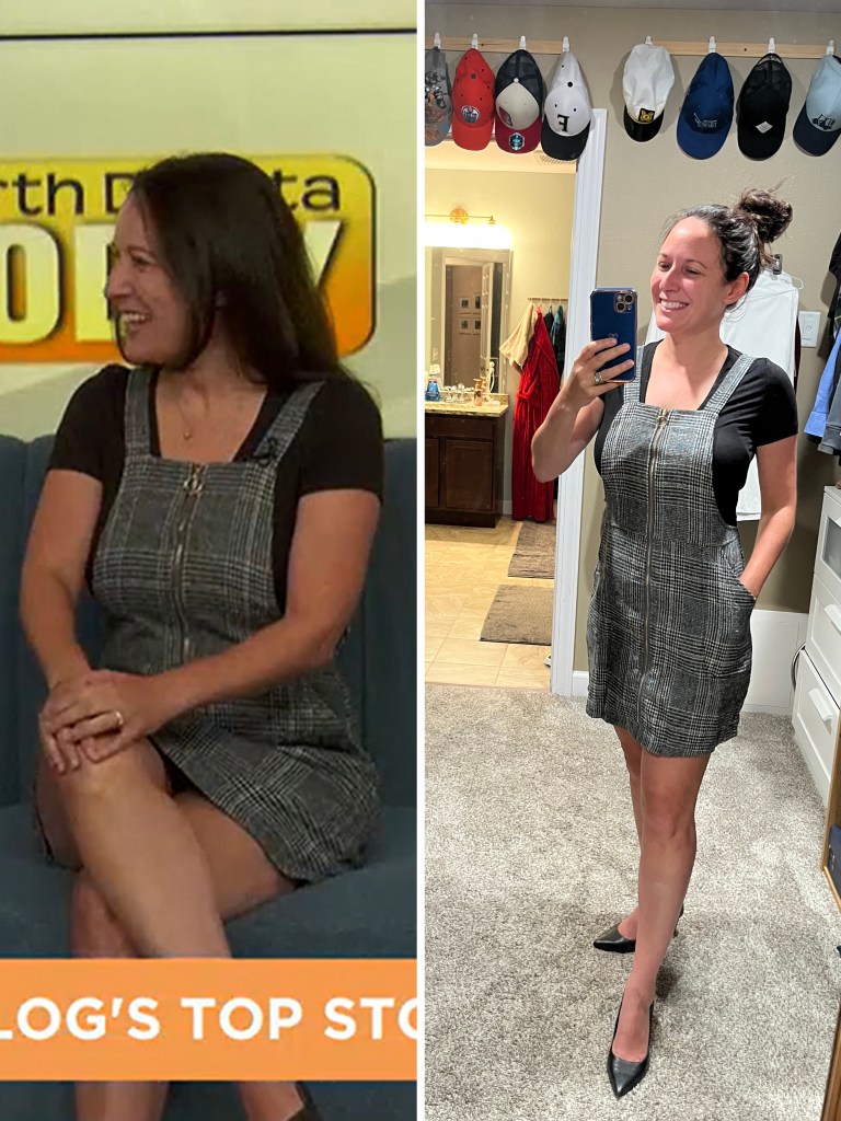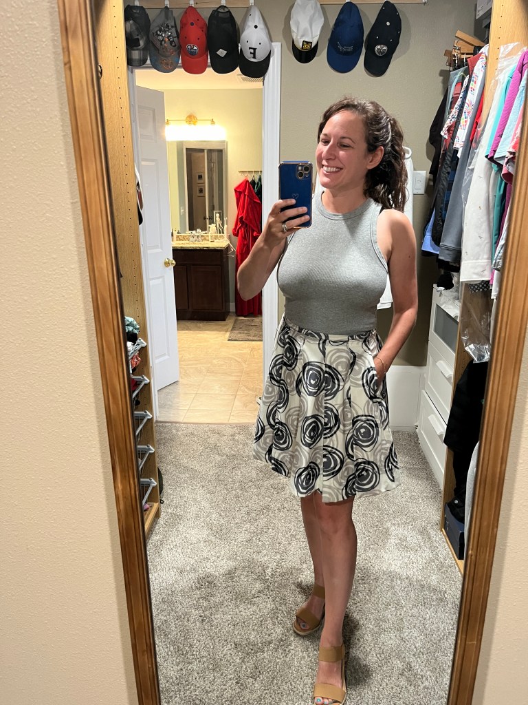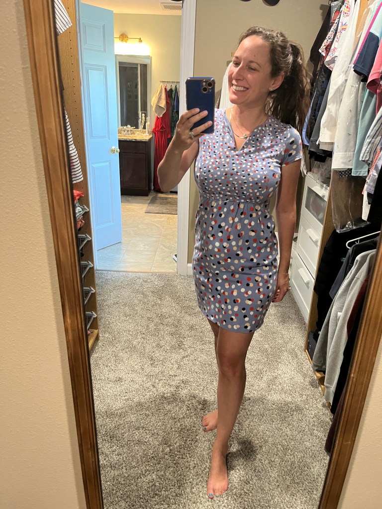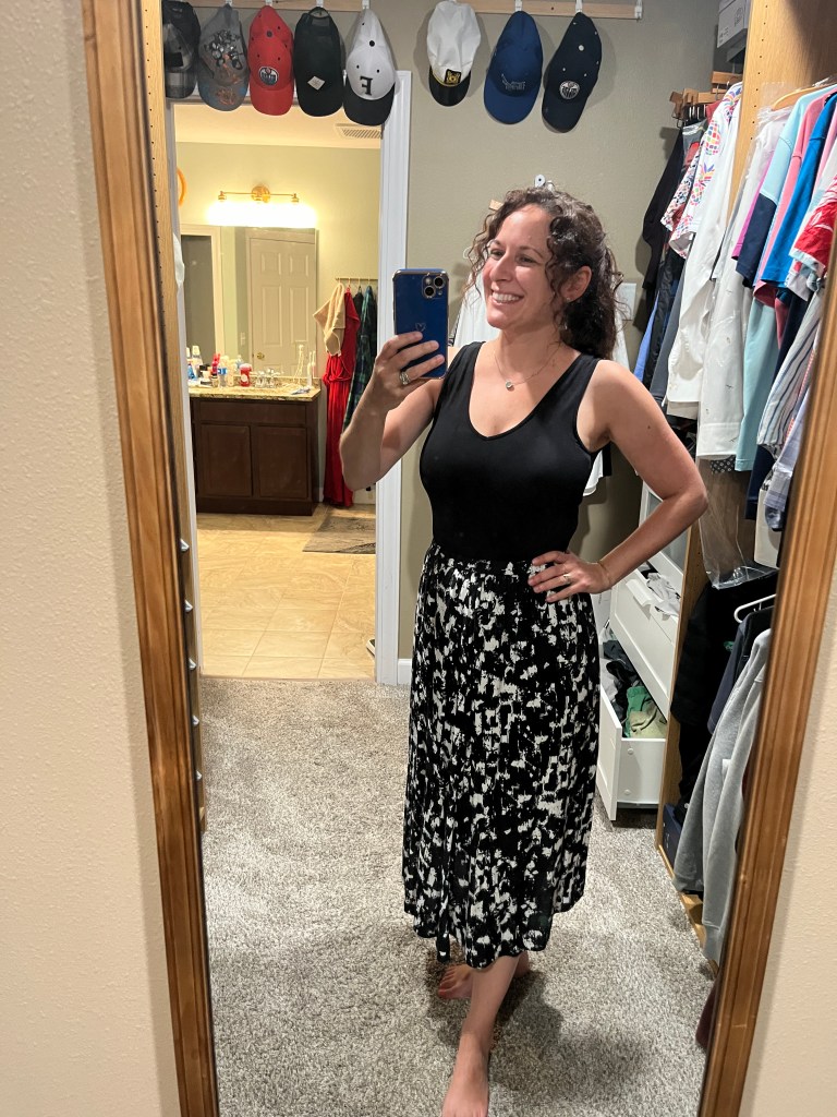 My sister bought me this dress from J Crew when I got my first job out of college, and I hadn’t worn it in like 20 years because I had gained a bit of weight and, uh, it didn’t zip. Well, thanks to my daily 3 mile walks, I can squeeze my old butt back into it.